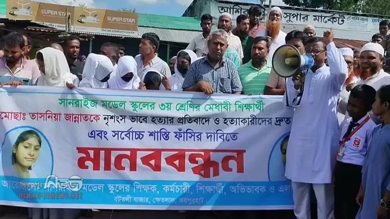 জয়পুরহাটের ক্ষেতলালে তৃতীয় শ্রেণির মেধাবী শিক্ষার্থী তাসনিয়া জান্নাত হত্যার প্রতিবাদে মানববন্ধন কর্মসূচি অনুষ্ঠিত হয়েছে।