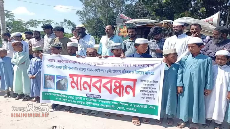 বোদা (পঞ্চগড়) প্রতিনিধিঃ পঞ্চগড়ের বোদায় হযরত আবু বক্করসিদ্দিক (রা) নুরানী ও হাফিজিয়া মাদ্রাসার শিক্ষকের উপর সন্ত্রাসী হামলার প্রতিবাদ ও বিচারের দাবিতে মানববন্ধন অনুষ্ঠিত হয়েছে।