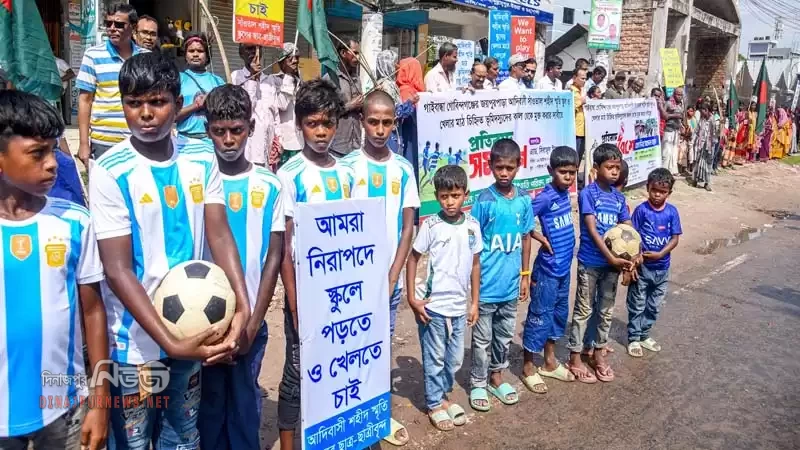 সাঁওতালদের শহীদ স্মৃতি স্কুল ও খেলার মাঠ দখলমুক্তের দাবীতে মানববন্ধন