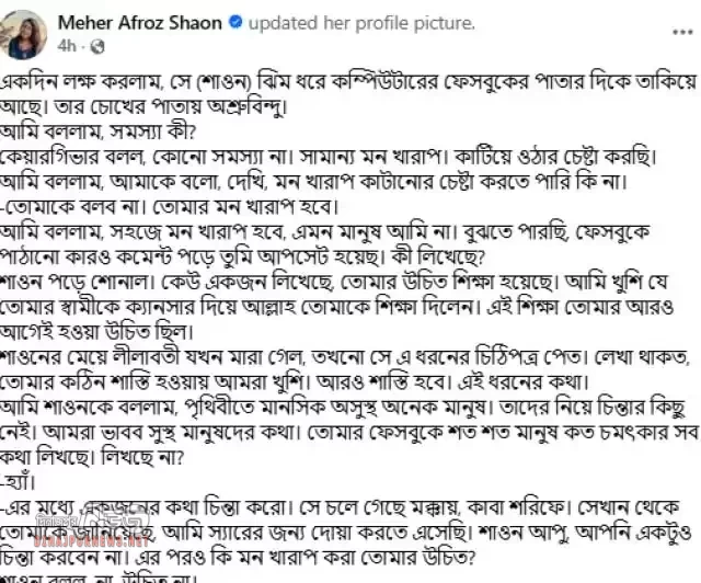 রোববার (৫ অক্টোবর) নিজের ফেসবুকে শাওন তুলে ধরেছেন কীভাবে স্বামীর (হুমায়ূন আহমেদ) অসুস্থতার সময় ফেসবুকে বিদ্রুপ মন্তব্য করেছিল। শাওনের পোস্টটি হুবহু তুলে ধরা হলো :
