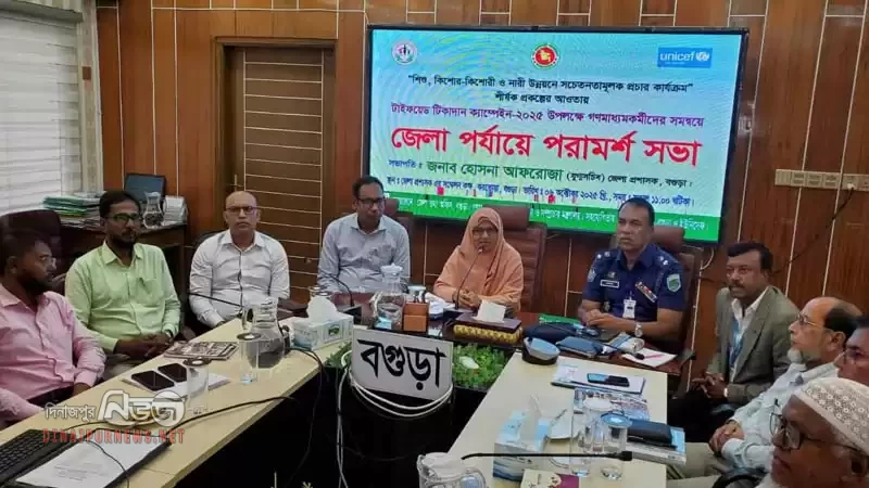 জেলা প্রশাসক হোসনা আফরোজার সভাপতিত্বে অনুষ্ঠিত সভায় উপস্থিত ছিলেন পুলিশ সুপার জেদান আল মুসা, জেলা পরিষদের প্রধান নির্বাহী কর্মকর্তা গাজী শাহনেওয়াজ, অতিরিক্ত জেলা প্রশাসক মেজবাউল করিম, সিভিল সার্জন ডা. খুরশিদ আলম, সিনিয়র তথ্য কর্মকর্তা মাহফুজার রহমান, বগুড়া প্রেসক্লাব সভাপতি রেজাউল হাসান রানু, সাংবাদিক ইউনিয়নের সভাপতি গণেশ দাস ও সাধারণ সম্পাদক এসএম আবু সাঈদসহ ইউনিসেফ প্রতিনিধি শহিদুল হাসান।