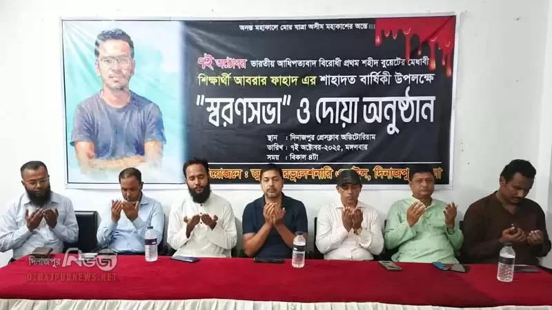 দিনাজপুরে আবরার ফাহাদ-এর শাহাদত বার্ষিকী উপলক্ষ্যে স্মরণ সভা ও দোয়া অনুষ্ঠিত