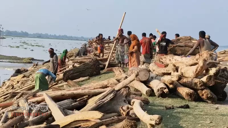 গত রোববার(০৫ অক্টোবর) বিকেল থেকে ভুরুঙ্গামারী উপজেলার শিলখুড়ি ইউনিয়নের ঢলডাঙা ও শালঝোড় এলাকায় কালজানি নদী দিয়ে ভারতীয় পুষ্পা সিনেমার দৃশ্যের মতো এসব কাঠের গুঁড়ি ভেসে আসতে শুরু করে। সোমবার সেই কাঠ কালজানি নদীর ভাটিতে দুধকুমার নদ হয়ে ব্রহ্মপুত্র নদে পৌচ্ছায়। এতে করে ভূরুঙ্গামারী, নাগেশ্বরী, কুড়িগ্রাম সদর, উলিপুর ও চিলমারী উপজেলায় ভোর হতেই নৌকা, বাঁশের ভেলা ও টায়ার টিউব নিয়ে নদীতে নামে স্থানীয় মানুষ। কেউ সাঁতরে, কেউ ভেলায় ভর করে কাঠ ধরার প্রতিযোগিতায় নামে। এসব কাঠ বিক্রির জন্য নদীপাড়ে অস্থায়ী হাট গড়ে উঠেছে।