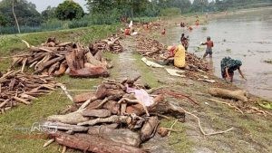 বগুড়ার ধুনটে যমুনা নদীর পানিতে ভেসে আসছে কাঠের টুকরা